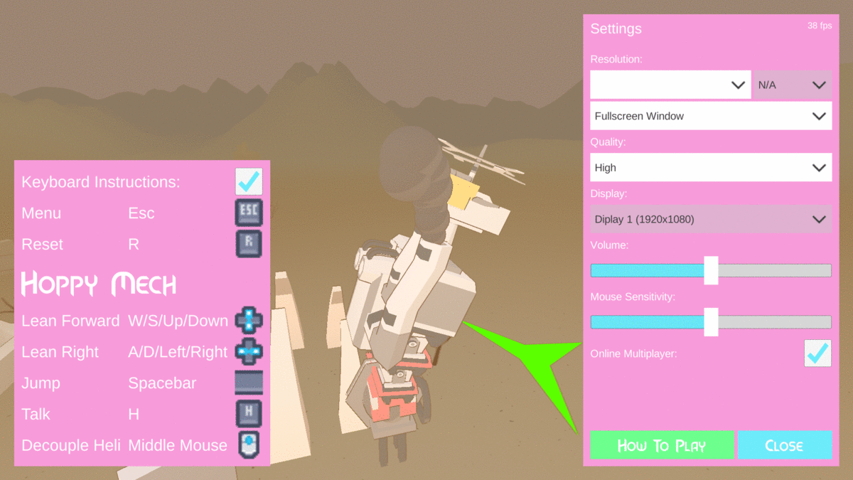 Also thanks to some early playtests by friends in Biome Collective & the Mech Jam discord I knew I was going to need some proper options for mouse sensitivity & game volume. Along with control listings in the game to help new players figure out each mech as they progressed through the game. I am quite happy with the quick mech specific control UI I managed to throw together; which can be toggled between keyboard/controller input displays. (I also wanted them to pop up when entering a new mech but ran out of time)