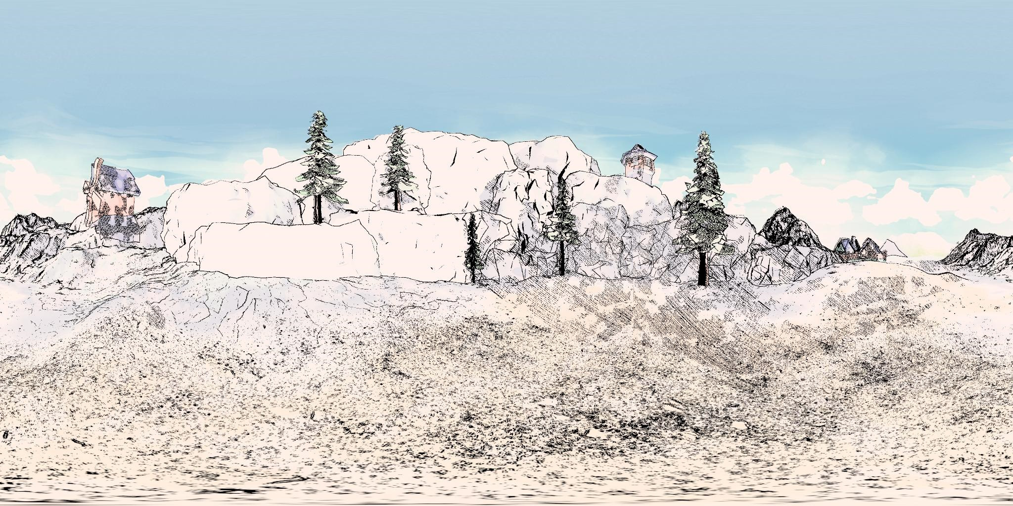 I used surface and post process shaders to unify the art style and achieve a hand drawn style. This way I could model the explorable space in 3D, then drop the players at any point in it while they travel to show what they can see!
