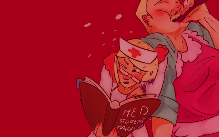 A cooperative mobile phone party game. Players work together to perform surgery, taking on the roles of two drunk medical students the night before their final exam. The goal is to keep the patient alive for as long as possible, but all the players are equipped with are kitchen tools and an incomprehensible manual. The doctor's role is to use a tool on the heart, then request the next tool from the nurse. The nurse must then look up the tool, select the right one, & tell the doctor which action to perform.